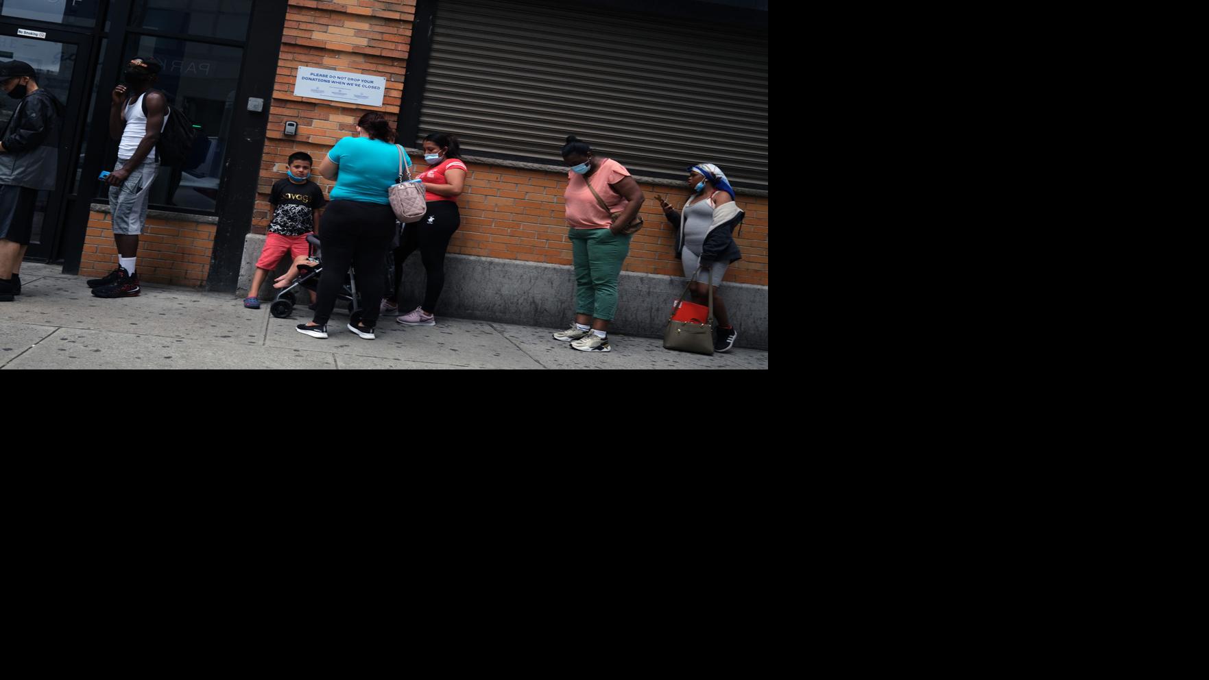 People wait in line for food assistance cards on July 7, 2020 in the Brooklyn borough of New York City.
