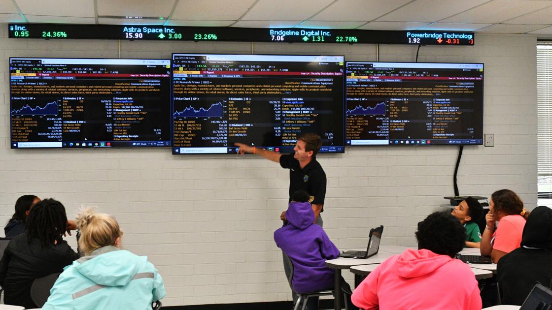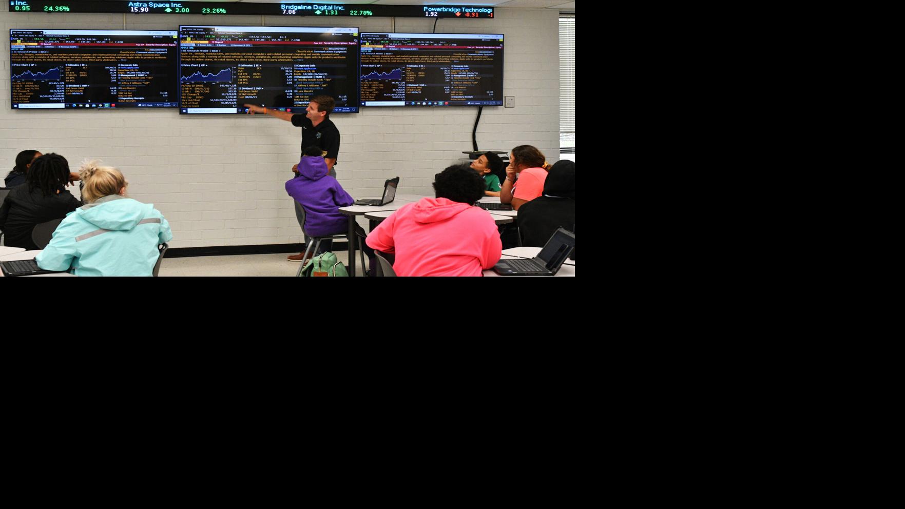 South Florence teacher Aaron Stevens talks with his students about the stock market and the consequences of market fluctuation.