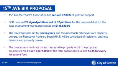 15th Avenue's BIA is on track to becoming the eleventh in Seattle and would be the second-smallest in the city in terms of assessment, with 37 properties along the street between E Denny Way and E Mercer Street, including large property owners like Kaiser Permanente and Safeway , taxed to