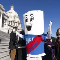 A man dressed as the "Build Back Better Bill" reacts Friday on Capitol Hill in Washington after House passage of President Joe Biden's expansive social and environment bill.